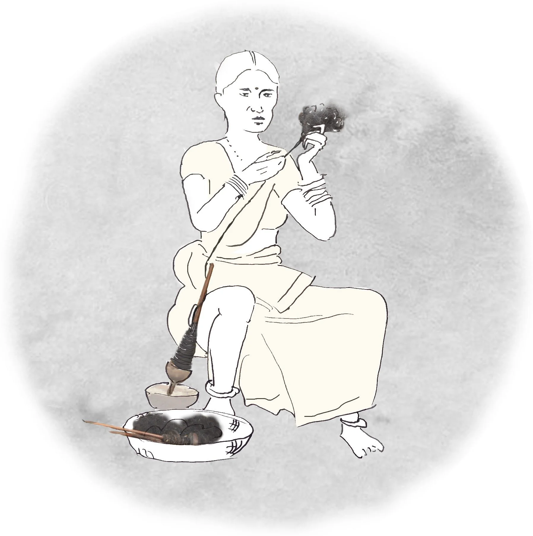 Many pastoral women still spin wool on their thighs. Illustration by Sandeep Virmani.